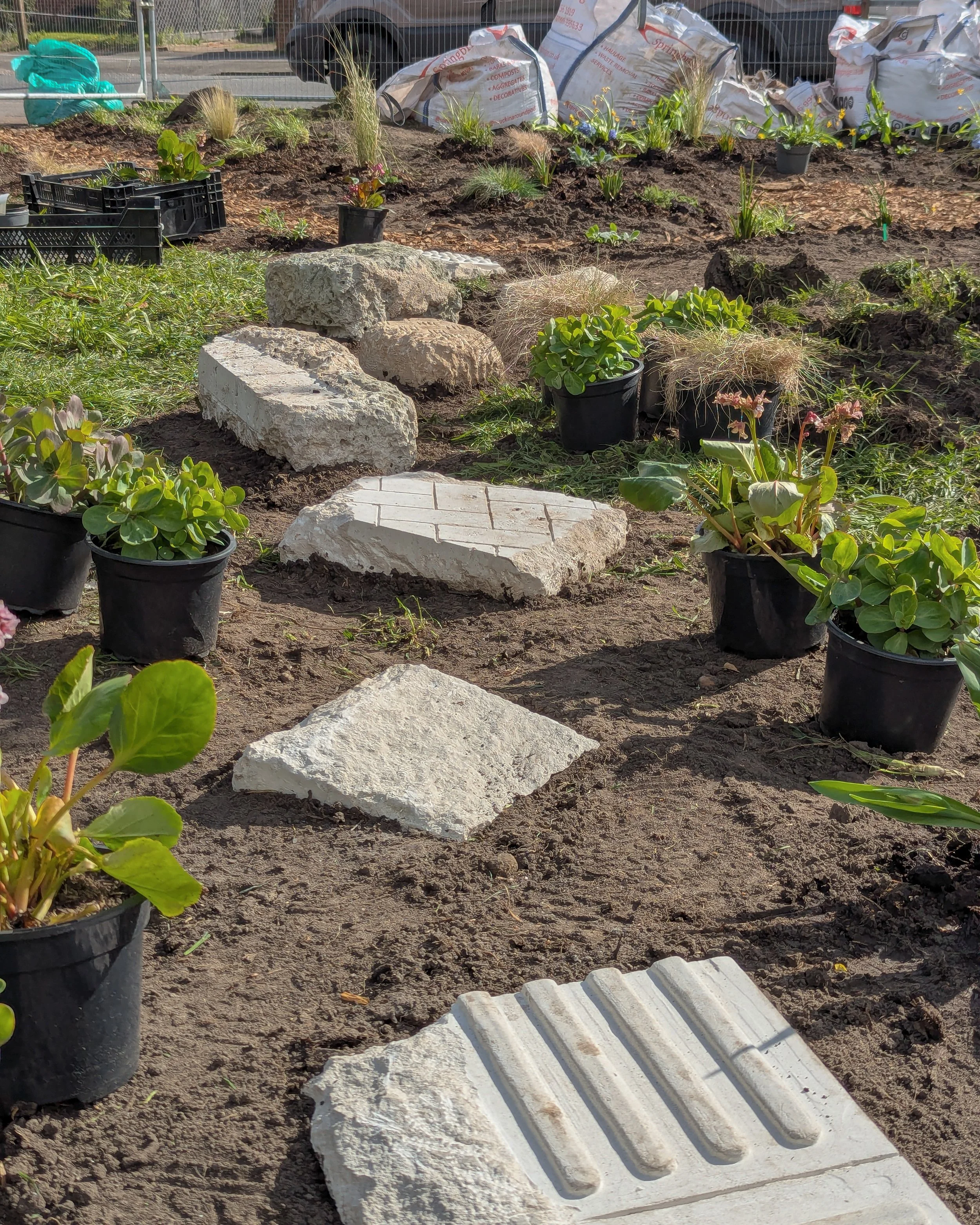 For the natural play-on-the-way boulders, we have been working with local stone sculptor Edgar Ward to develop designs that reference often overlooked parts of the surrounding streets. The boulders re-use offcuts and waste material from UK quarries, and feature patterns and textures drawn directly from a clay tile making workshop we undertook in Morden last year.