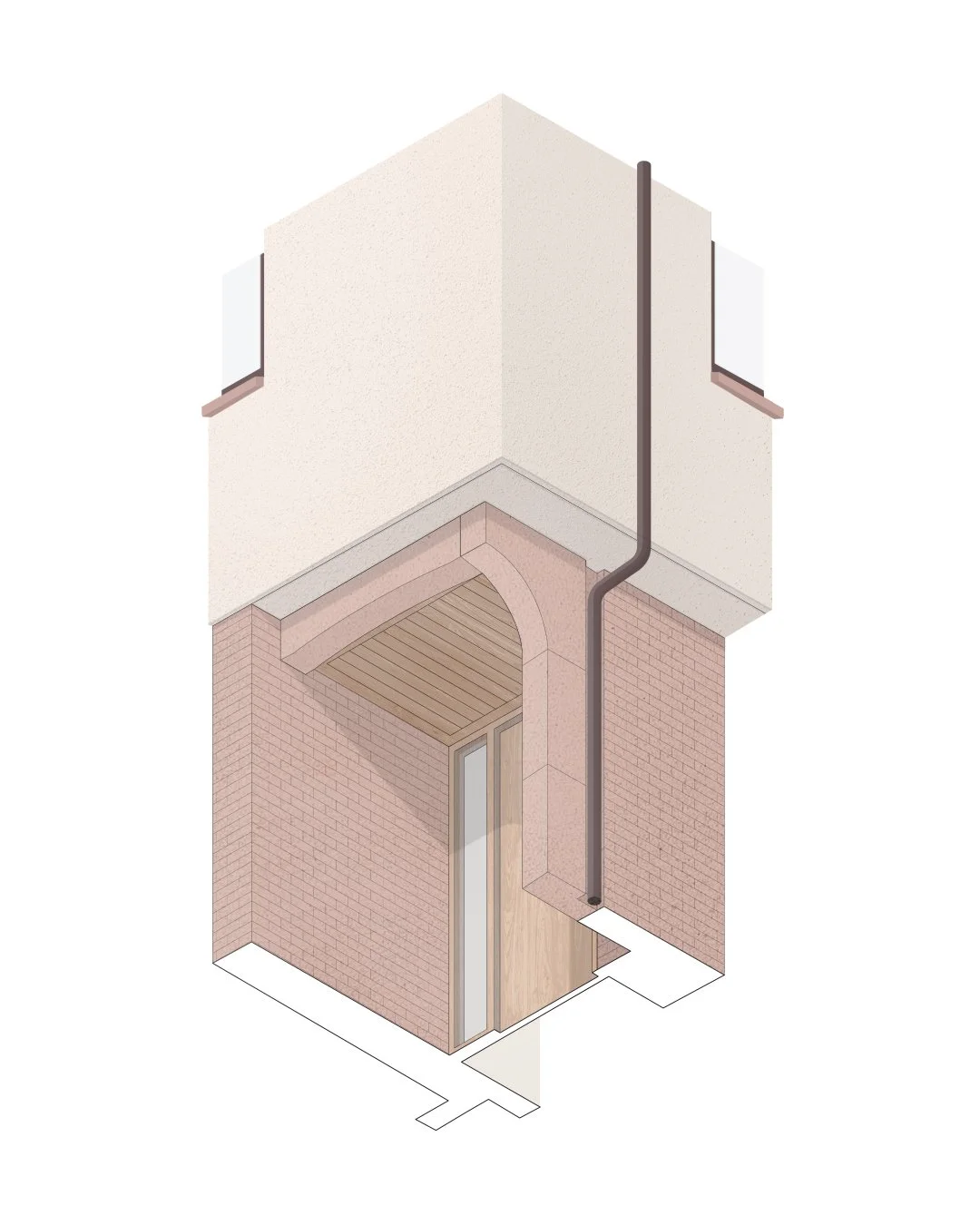 Design for sculptural stone porch surround, sourced from the same quarry as the brick masonry.