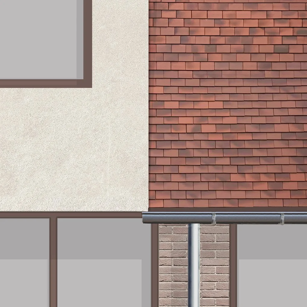 Material palette elevation sketch - Drawing on the area’s geological history and architectural heritage, the design pairs sandstone, tied to the prehistoric landscape, with the red brick language of Victorian Torbay. This synthesis grounds the house in its unique setting, creating a dialogue between natural history and built form.